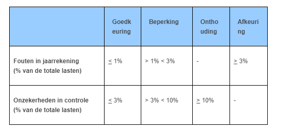 Bij controle van de jaarrekening hanteert de accountant toleranties. Voor een goedkeuring mag het aantal fouten in de jaarrekening (voor de getrouwheid en rechtmatigheid samen) niet meer dan 1% van de totale lasten zijn. Tevens mogen de onzekerheden in de controle niet meer dan 3% van de totale lasten bedragen. Afhankelijk van de gedane constateringen van de accountant kan dit leiden tot de volgende verklaringen: